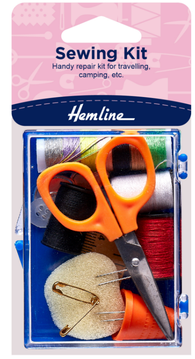 Handy repair kit for travelling, camping, etc. Contains: safety pins, buttons, assorted thread, scissors, needles, needle threader and press snaps. Clear view snap-top box.